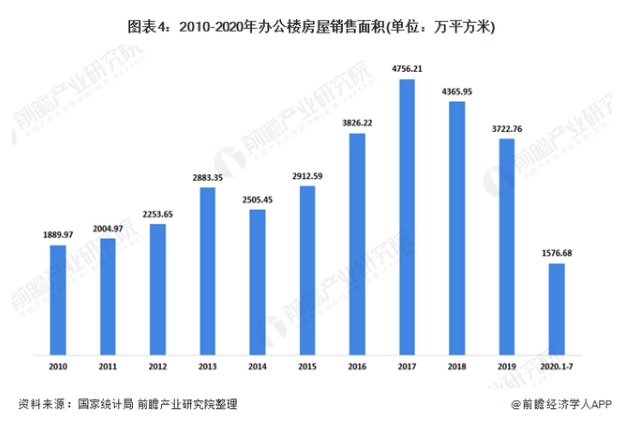 2010-2017年,全國辦公樓房屋銷售面積逐年上升,2017年達到4756.21萬平方米,為近年來最高值,2018-2019年房屋竣工面積出現(xiàn)下降,2019年為3722.76萬平方米,同比下降14.73%。