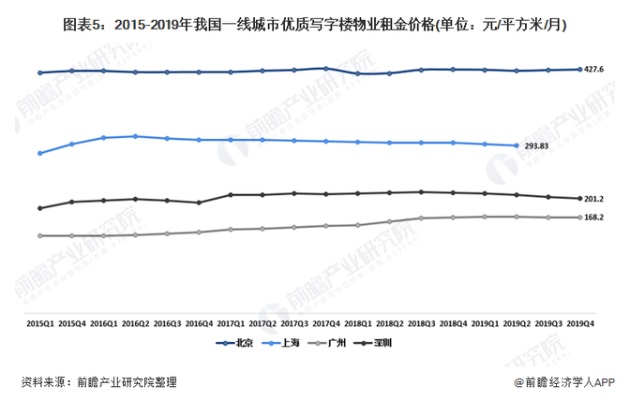 近年來,我國經(jīng)濟增速放緩,導致寫字樓的需求也有所放緩,租金上漲速度趨緩。在一線城市中,北京的優(yōu)質(zhì)寫字樓由于供給相對緊張,空置率不斷下降,租金也不斷上升。2019年末,北京市的租金為427.6元/平方米/月,位居榜首;其次是上海市;此外,廣州和深圳的租金分別為168.2和201.2元/平方米/月。