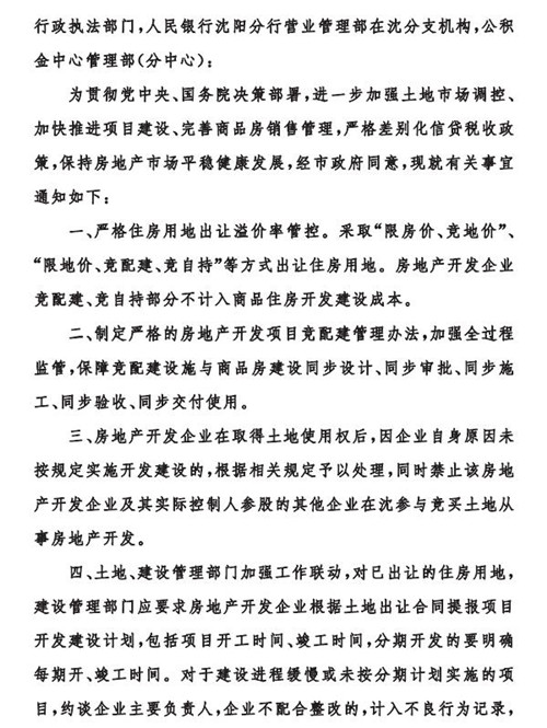 房訊網訊 9月6日,遼寧省沈陽市房產局聯(lián)合多部門發(fā)布關于《關于進一步促進我市房地產市場穩(wěn)定健康發(fā)展的通知》,《通知》指出,嚴格住房用地出讓溢價率管控。采取“限房價、競地價”、 “限地價、競配建、競自持”等方式出讓住房用地。房地產開發(fā)企業(yè)競配建、競自持部分不計入商品住房開發(fā)建設成本。