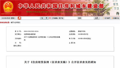 房訊網訊 9月7日,住建部關于《住房租賃條例(征求意見稿)》公開征求意見的通知,為了提高住房租賃立法質量,根據工作安排,將《住房租賃條例(征求意見稿)》向社會公開征求意見。意見反饋截止日期為2020年10月8日!稐l例》包括總則、出租與承租、租賃企業(yè)、經紀活動、扶持措施、服務與監(jiān)督、法律責任和附則等8章。