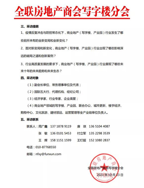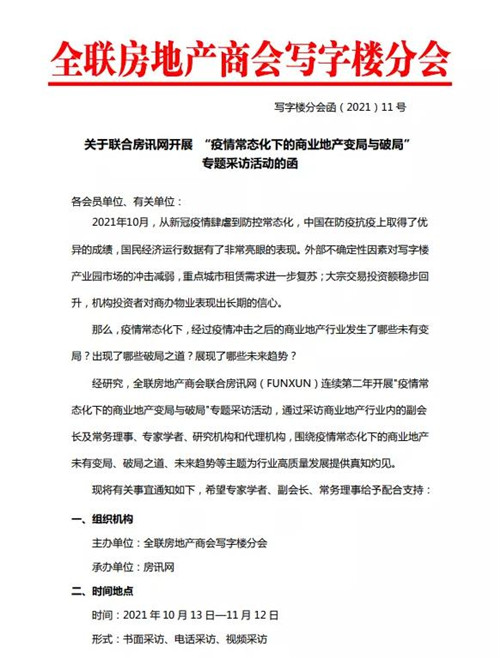10月13日起,全聯(lián)房地產(chǎn)商會(huì)聯(lián)合房訊網(wǎng)(FUNXUN),再度開展"中國(guó)房地產(chǎn)50人"專題采訪行動(dòng),包括新商辦50人、新園區(qū)50人專題采訪行動(dòng),采集行業(yè)意見,聆聽大咖聲音,揭秘疫情防控常態(tài)化下寫字樓產(chǎn)業(yè)園市場(chǎng)現(xiàn)狀,探尋行業(yè)創(chuàng)新發(fā)展路徑,揭幕中國(guó)商業(yè)地產(chǎn)高質(zhì)量發(fā)展的下一個(gè)十年。