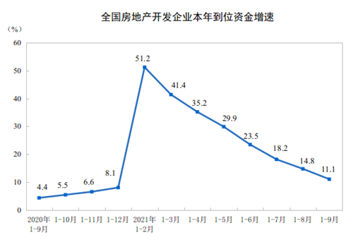 1—9月份,房地產(chǎn)開發(fā)企業(yè)到位資金151486億元,同比增長11.1%;比2019年1—9月份增長16.0%,兩年平均增長7.7%。其中,國內(nèi)貸款18770億元,下降8.4%;利用外資59億元,下降36.9%;自籌資金47212億元,增長6.1%;定金及預(yù)收款56689億元,增長25.6%;個(gè)人按揭貸款24124億元,增長10.7%。