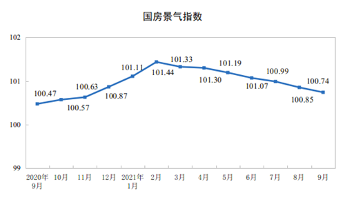 9月份,房地產(chǎn)開發(fā)景氣指數(shù)(簡稱“國房景氣指數(shù)”)為100.74。