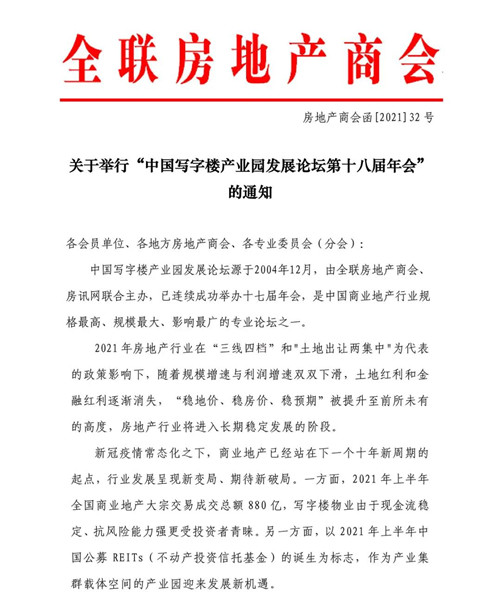 房訊網(wǎng)訊 日前,全聯(lián)房地產(chǎn)商會(huì)發(fā)布《關(guān)于召開"中國寫字樓產(chǎn)業(yè)園發(fā)展論壇第十八屆年會(huì)"的通知》,中國寫字樓產(chǎn)業(yè)園發(fā)展論壇第十八屆年會(huì)定于2021年12月8-9日在北京富力萬麗酒店舉行,論壇主題為"變局與破局:商業(yè)地產(chǎn)的下一個(gè)十年"。
