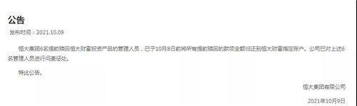 此前于9月18日凌晨,恒大集團(tuán)官方網(wǎng)站發(fā)布公告稱,針對(duì)部分管理人員提前贖回恒大財(cái)富投資產(chǎn)品一事,集團(tuán)公司高度重視,已要求該6名管理人員提前贖回的所有款項(xiàng)必須限期返回,并給予嚴(yán)厲懲處。