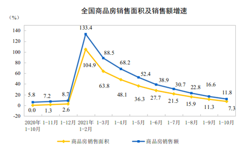1—10月份,商品房銷售面積143041萬平方米,同比增長7.3%;比2019年1—10月份增長7.3%,兩年平均增長3.6%。其中,住宅銷售面積增長7.1%,辦公樓銷售面積增長2.4%,商業(yè)營業(yè)用房銷售面積下降0.6%。商品房銷售額147185億元,增長11.8%;比2019年1—10月份增長18.3%,兩年平均增長8.8%。其中,住宅銷售額增長12.7%,辦公樓銷售額下降1.6%,商業(yè)營業(yè)用房銷售額下降0.6%。