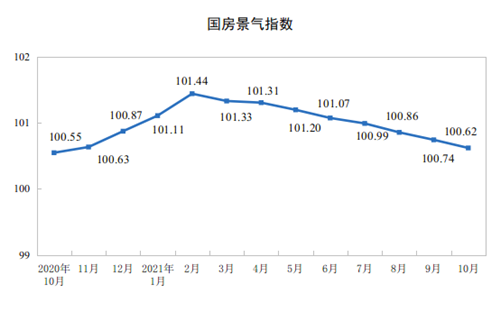10月份,房地產開發(fā)景氣指數(簡稱“國房景氣指數”)為100.62。