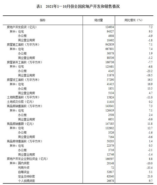 1—10月份,全國房地產開發(fā)投資124934億元,同比增長7.2%;比2019年1—10月份增長14.0%,兩年平均增長6.8%。其中,住宅投資94327億元,增長9.3%。