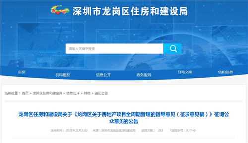 房訊網(wǎng)訊 近日,深圳龍崗區(qū)住建局發(fā)布《龍崗區(qū)關(guān)于房地產(chǎn)項(xiàng)目全周期管理的指導(dǎo)意見(征求意見稿)》,公開征求市民和各單位意見,公示時(shí)間為2021年11月23日至2021年12月22日。