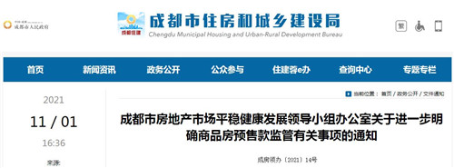 房訊網(wǎng)訊 近日,成都市房地產(chǎn)市場(chǎng)平穩(wěn)健康發(fā)展領(lǐng)導(dǎo)小組辦公室發(fā)布《關(guān)于進(jìn)一步明確商品房預(yù)售款監(jiān)管有關(guān)事項(xiàng)的通知》,進(jìn)一步規(guī)范市場(chǎng)行為,提高預(yù)售資金使用效率,保障預(yù)售資金用于工程建設(shè),切實(shí)維護(hù)人民群眾合法權(quán)益,促進(jìn)我市房地產(chǎn)市場(chǎng)平穩(wěn)健康發(fā)展。