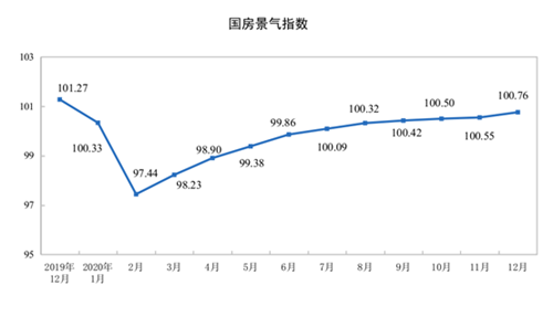 12月份,房地產(chǎn)開發(fā)景氣指數(shù)(簡稱“國房景氣指數(shù)”)為100.76,比11月份提高0.21點。