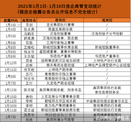 記者梳理發(fā)現(xiàn),在2021年初涌現(xiàn)的房企高管“離職潮”中,目前宣布高管離任的企業(yè)已超過15家,涉及龍光集團(tuán)、榮盛發(fā)展、新城控股、華遠(yuǎn)地產(chǎn)、上坤地產(chǎn)等企業(yè),崗位則涉及公司董事長(zhǎng)、總裁、董事等高層。