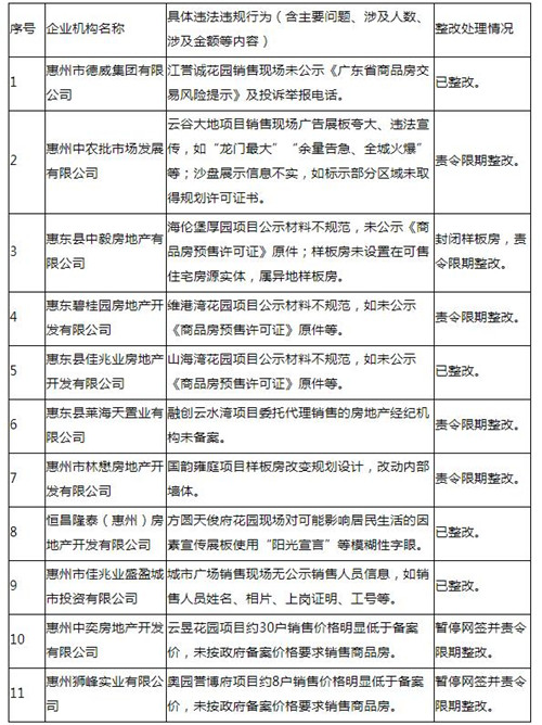 房訊網(wǎng)訊 11月4日,惠州市住房和城鄉(xiāng)建設(shè)局發(fā)布《關(guān)于2021年第四季度查處違法違規(guī)房地產(chǎn)開發(fā)企業(yè)的情況通報》,11個房地產(chǎn)開發(fā)企業(yè)及項目被通報,責(zé)令限期整改。