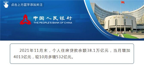 房訊網(wǎng)訊 12月13日,央行發(fā)布2021年11月個人住房貸款統(tǒng)計數(shù)據(jù)顯示,2021年11月末,個人住房貸款余額38.1萬億元,當(dāng)月增加4013億元,較10月多增532億元。業(yè)內(nèi)分析認(rèn)為,該數(shù)據(jù)的環(huán)比增長代表了房地產(chǎn)貸款市場的寬松。