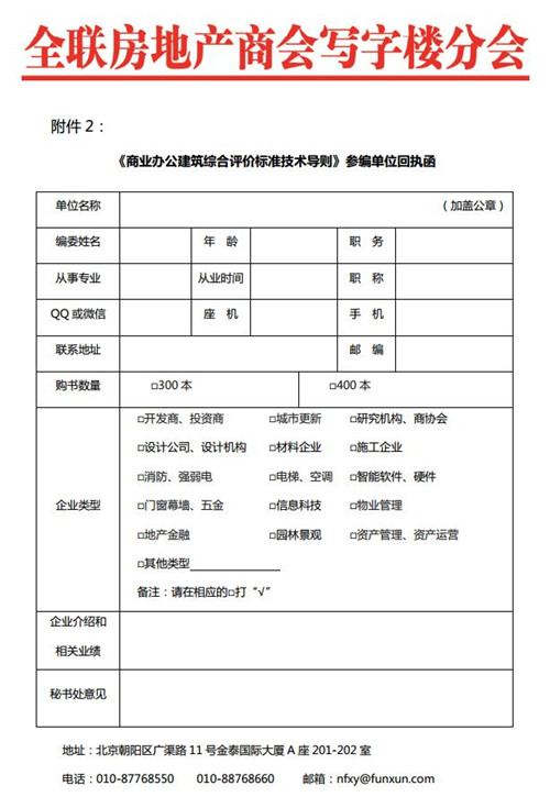 有參編意向的單位,請將加蓋單位公章的《商業(yè)辦公建筑綜合評價標(biāo)準(zhǔn)技術(shù)導(dǎo)則》參編單位回執(zhí)函(附件 2),以電子郵件或郵寄方式,反饋至寫字樓分會。