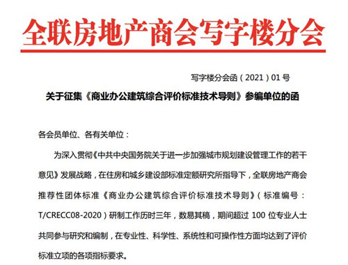 關(guān)于征集《商業(yè)辦公建筑綜合評價標(biāo)準(zhǔn)技術(shù)導(dǎo)則》參編單位的函
