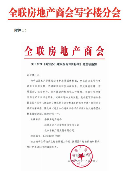 1、全聯(lián)房地產(chǎn)商會《商業(yè)辦公建筑綜合評價標(biāo)準(zhǔn)》批準(zhǔn)文件