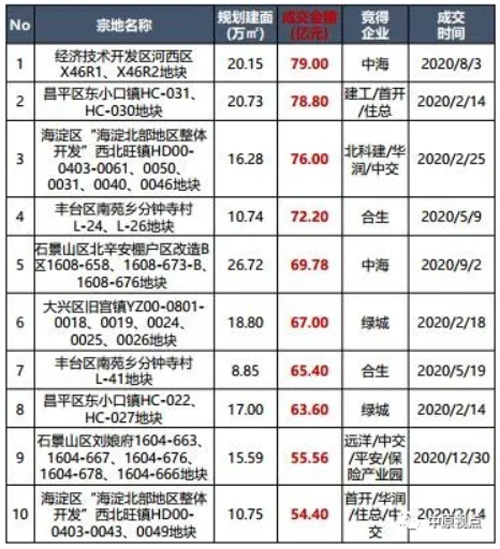 從單宗地塊成交狀況看,2020年,中海亦莊河西地塊成交金額最高;合生分鐘寺地塊成交樓面價(jià)突破歷史新高。