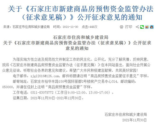房訊網(wǎng)訊 為促進房地產(chǎn)市場平穩(wěn)健康發(fā)展,保護購房人的合法權益,規(guī)范新建商品房預售資金監(jiān)督管理,保障工程建設順利完成,11月30日,石家莊住建局發(fā)布《石家莊市新建商品房預售資金監(jiān)管辦法(征求意見稿)》,面向社會開展公眾意見征詢。