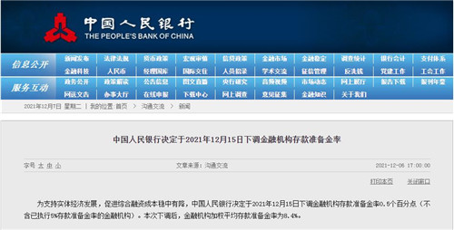 房訊網(wǎng)訊 據(jù)央行官網(wǎng)消息,為支持實(shí)體經(jīng)濟(jì)發(fā)展,促進(jìn)綜合融資成本穩(wěn)中有降,中國人民銀行決定于2021年12月15日下調(diào)金融機(jī)構(gòu)存款準(zhǔn)備金率0.5個百分點(diǎn)(不含已執(zhí)行5%存款準(zhǔn)備金率的金融機(jī)構(gòu))。本次下調(diào)后,金融機(jī)構(gòu)加權(quán)平均存款準(zhǔn)備金率為8.4%。