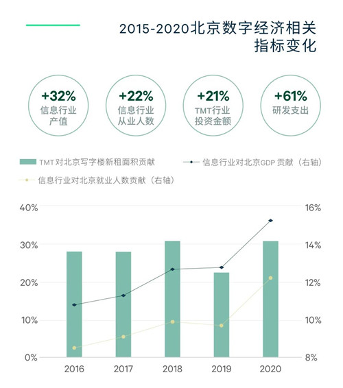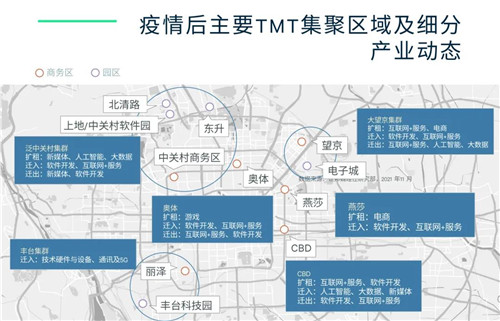 根據(jù)報告可知,TMT產(chǎn)業(yè)早已成為商業(yè)地產(chǎn)需求的支柱行業(yè)之一,2020年,TMT企業(yè)對北京寫字樓新租面積貢獻(xiàn)高達(dá)32%;中關(guān)村、望京商務(wù)區(qū)的數(shù)字企業(yè)集聚優(yōu)勢凸顯,企業(yè)的旺盛需求也帶動了商務(wù)區(qū)周邊園區(qū)產(chǎn)業(yè)辦公的發(fā)展。