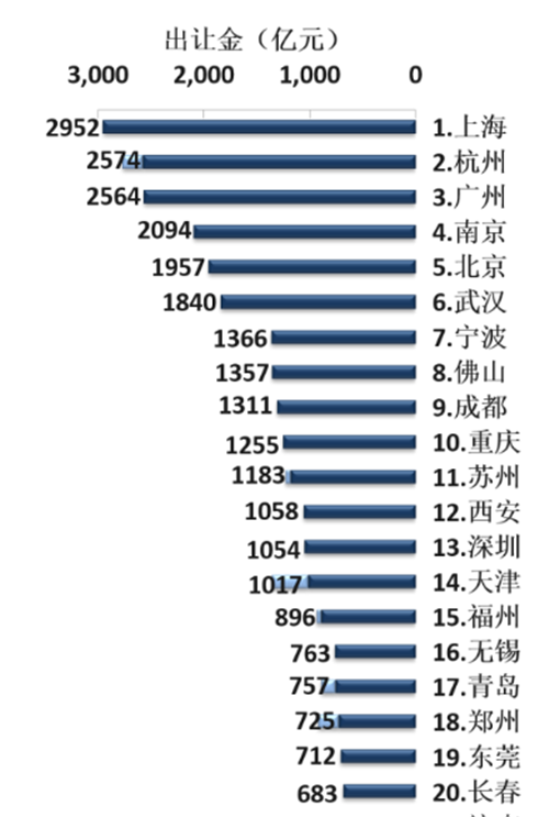 2020年土地出讓金額TOP20城市 數(shù)據(jù)來源:中指研究院
