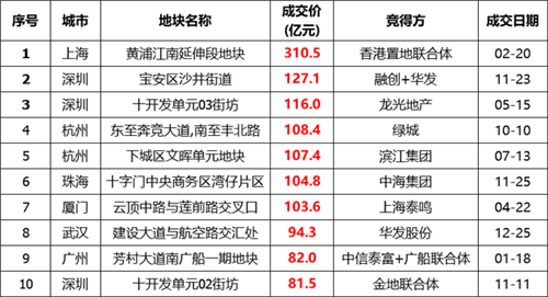 不過,盡管房企拿地面積有所下滑,但2020年多宗土地成交總價紀錄不斷被刷新,各地“地王”項目頻出。其中7宗土地成交總價超百億元,主要分布在了一二線城市,其中深圳、杭州各兩宗,上海、廈門、珠海各一席。