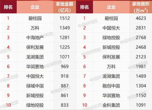 中指院數(shù)據(jù)顯示,2020年TOP100房企拿地總額32337億元,拿地規(guī)模同比增長14.0%。其中,拿地金額超過千億元的房企有5家,碧桂園以1512億元居榜首,萬科、中海、保利、龍湖分別以1349億、1281億元、1225億元、1071億元分別第2至5位。