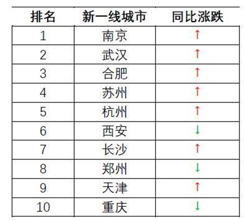 在新一線城市中,找房熱度前十位城市中有七個(gè)城市同比上漲,部分城市同比上漲幅度接近三倍。西安、鄭州、重慶三個(gè)城市雖然同比下跌但跌幅較小,總體穩(wěn)定。整體來(lái)看,新一線城市新房找房熱度大幅高于去年同期水平,找房熱度前三的城市為南京、武漢與合肥。