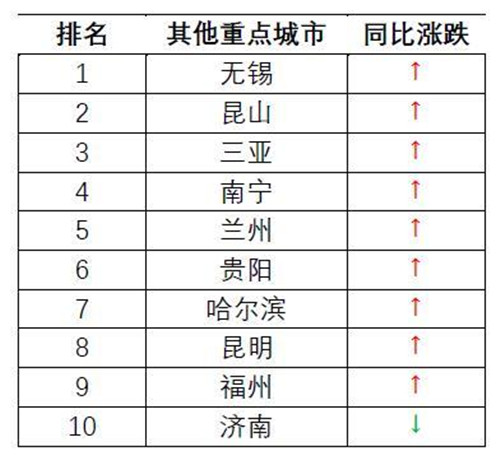 其他重點(diǎn)城市找房熱度前十的城市除濟(jì)南同比下降,其余九個(gè)城市找房熱度均有上漲,其中找房熱度同比最高上漲六倍。找房熱度排名前兩名的城市無(wú)錫與昆山為長(zhǎng)三角城市,排名第三的是海南省旅游城市三亞。