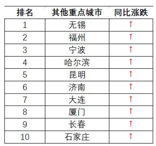 其他重點(diǎn)城市二手房找房熱度排名前十城市同比均有不同程度的上漲,其中,無(wú)錫、福州與寧波二手房找房熱度排名前三。其他重點(diǎn)城市中二手房找房熱度排名靠前的省會(huì)城市較多,哈爾濱、昆明、濟(jì)南等均上榜。