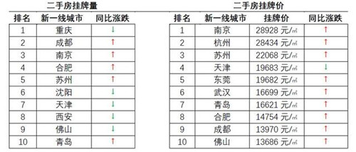 新一線城市中二手房掛牌量排名前十城市中,相比去年春節(jié)同期上漲的城市占比達(dá)到一半,沈陽(yáng)與西安同比下跌較多,其他城市微跌;二手房掛牌價(jià)格排名前十城市除天津外同比均有不同程度上漲,南京排名第一達(dá)到28928元/㎡。