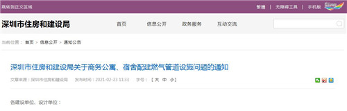 房訊網(wǎng)訊 2月23日,深圳住建局發(fā)布關于商務公寓、宿舍配建燃氣管道設施問題的通知。