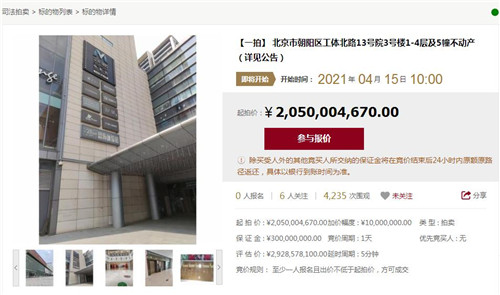房訊網(wǎng)訊 據(jù)北京產(chǎn)權(quán)交易所披露,北京世茂工三將于4月15日在北交互聯(lián)網(wǎng)絡(luò)司法拍賣(mài)平臺(tái)上進(jìn)行公開(kāi)拍賣(mài),評(píng)估價(jià)為29.29億元,起拍價(jià)為20.5億元。本次拍賣(mài)為第一次拍賣(mài),時(shí)間為4月15日10時(shí)至4月16日10時(shí)止。