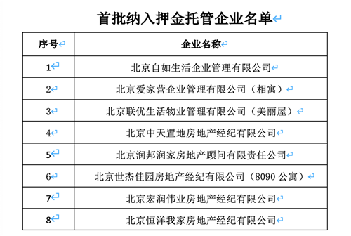 該協(xié)會(huì)還公布了首批納入押金托管的企業(yè)名單,包括北京自如生活企業(yè)管理有限公司、北京愛家營(yíng)企業(yè)管理有限公司(相寓)等8家企業(yè)。