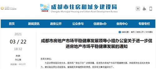 房訊網(wǎng)訊 3月22日,成都市房地產(chǎn)市場平穩(wěn)健康發(fā)展領(lǐng)導(dǎo)小組辦公室發(fā)布《關(guān)于進(jìn)一步促進(jìn)房地產(chǎn)市場平穩(wěn)健康發(fā)展的通知》,從強(qiáng)化住宅用地供應(yīng)管理、深化房價地價聯(lián)動機(jī)制、加大住房保障力度、加強(qiáng)住房交易管理、嚴(yán)格金融審慎監(jiān)管、加強(qiáng)市場秩序監(jiān)管、落實(shí)調(diào)控主體責(zé)任等7個方面提出了16條具體措施。