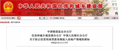 房訊網(wǎng)訊 3月26日,中國銀保監(jiān)會辦公廳、住房和城鄉(xiāng)建設(shè)部辦公廳、中國人民銀行辦公廳聯(lián)合印發(fā)了《關(guān)于防止經(jīng)營用途貸款違規(guī)流入房地產(chǎn)領(lǐng)域的通知》,從加強借款人資質(zhì)核查、加強信貸需求審核、加強貸款期限管理、加強貸款抵押物管理、加強貸中貸后管理、加強銀行內(nèi)部管理等九大方面,督促銀行業(yè)金融機構(gòu)進一步強化審慎合規(guī)經(jīng)營,嚴防經(jīng)營用途貸款違規(guī)流入房地產(chǎn)領(lǐng)域。