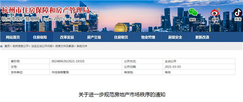 房訊網(wǎng)訊 3月3日,杭州市住保房管局發(fā)布《關(guān)于進一步規(guī)范房地產(chǎn)市場秩序的通知》,從進一步加強住房限購、嚴格防范經(jīng)營貸、消費貸違規(guī)流入房地產(chǎn)市場、嚴厲打擊房地產(chǎn)中介機構(gòu)違法違規(guī)行為、嚴格規(guī)范房地產(chǎn)市場信息發(fā)布四個方面加強房地產(chǎn)市場調(diào)控。