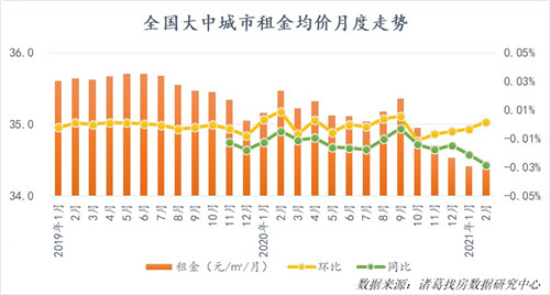 房訊網(wǎng)訊 據(jù)諸葛找房4日發(fā)布的2月全國大中城市租金均價(jià)報(bào)告,隨著疫情的陰霾逐漸褪去,租賃市場需求逐漸回升,開始呈現(xiàn)回溫跡象。數(shù)據(jù)顯示,2021年2月,全國大中城市租金掛牌均價(jià)為34.46元/平方米/月,環(huán)比上漲0.15%,本月租金水平止跌轉(zhuǎn)漲。
