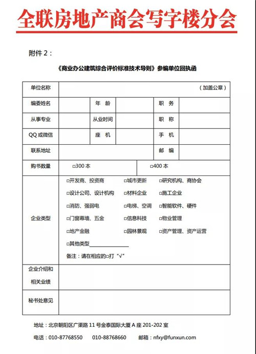 有參編意向的單位,請(qǐng)將加蓋單位公章的《商業(yè)辦公建筑綜合評(píng)價(jià)標(biāo)準(zhǔn)技術(shù)導(dǎo)則》參編單位回執(zhí)函(附件 2),以電子郵件或郵寄方式,反饋至寫字樓分會(huì)。
