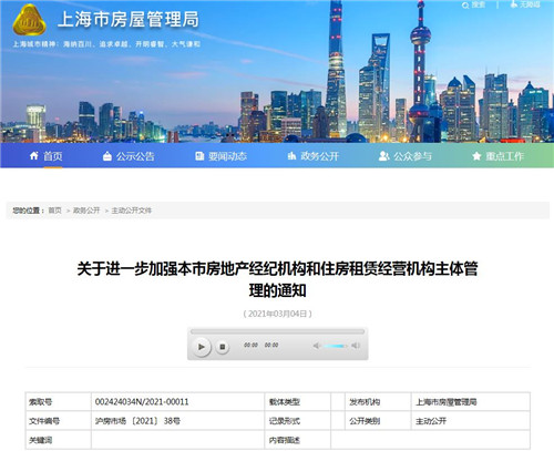 房訊網(wǎng)訊 3月4日,上海市房屋管理局發(fā)布《關(guān)于進(jìn)一步加強本市房地產(chǎn)經(jīng)紀(jì)機(jī)構(gòu)和住房租賃經(jīng)營機(jī)構(gòu)主體管理的通知》,提出加強房地產(chǎn)經(jīng)紀(jì)機(jī)構(gòu)備案管理、加強住房租賃經(jīng)營機(jī)構(gòu)開業(yè)報告(信息記載)管理、加強經(jīng)營主體入網(wǎng)認(rèn)證管理、建立健全行業(yè)信用體系和加強從業(yè)主體管理信息化支撐等五方面措施。