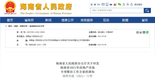 海南省人民政府辦公廳關(guān)于印發(fā)海南省2021年房地產(chǎn)市場(chǎng)專項(xiàng)整治工作方案的通知
