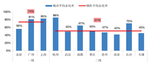 市場分化同樣存在,一季度共有130個項(xiàng)目開盤售罄,但主要集中在杭州、上海和成都,其中杭州獨(dú)占據(jù)69席,三個城市合計(jì)占比接近全部售罄項(xiàng)目的74%。包括杭州在內(nèi),廣州、上海、成都、長沙等5個城市去化率超過平均水平。特別值得關(guān)注的是,杭州、上海和廣州一季度平均去化均超8成;北京、重慶和武漢平均去化率分別為56%、50%和50%。