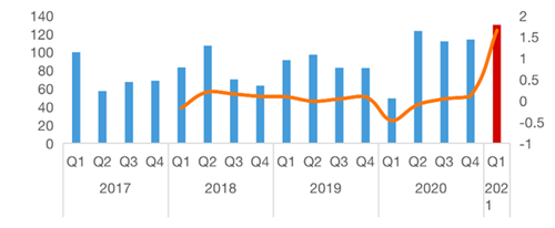 從利率來看,境內(nèi)一季度利率中位數(shù)4.40%,環(huán)比上一季度上升16個基點(diǎn),較2020年一季度上升48個基點(diǎn)。