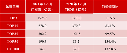 2021年1~3月TOP100各陣營銷售額門檻值情況 數(shù)據(jù)來源:中指院