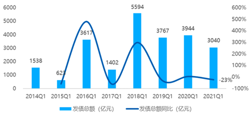 根據(jù)貝殼研究院統(tǒng)計(jì),2021年第一季度房企境內(nèi)外債券融資累計(jì)約3040億元,同比下降23%,為2018年以來首季度的最低發(fā)行規(guī)模。