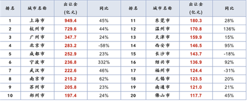 2021年1~3月全國土地出讓金TOP20(僅包含市本級數(shù)據(jù)) 來源:中指院