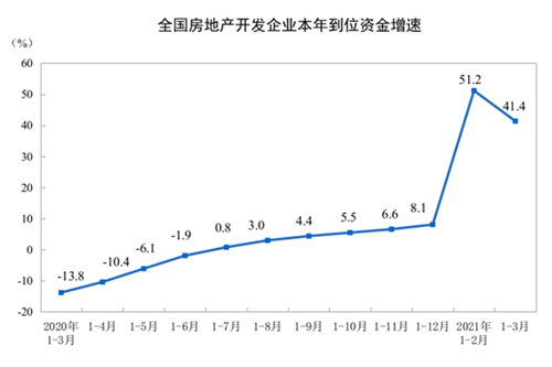 1—3月份,房地產(chǎn)開發(fā)企業(yè)到位資金47465億元,同比增長41.4%;比2019年1—3月份增長21.9%,兩年平均增長10.4%。其中,國內(nèi)貸款7222億元,增長7.5%;利用外資11億元,下降41.0%;自籌資金13015億元,增長21.0%;定金及預(yù)收款17759億元,增長86.1%;個人按揭貸款7843億元,增長50.0%。