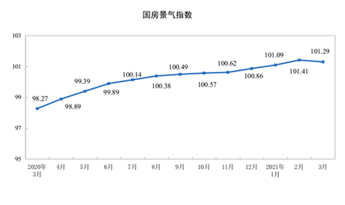 3月份,房地產(chǎn)開發(fā)景氣指數(shù)(簡稱“國房景氣指數(shù)”)為101.29。