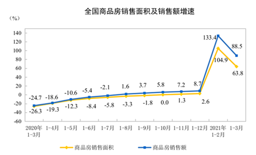 1—3月份,商品房銷售面積36007萬平方米,同比增長63.8%;比2019年1—3月份增長20.7%,兩年平均增長9.9%。其中,住宅銷售面積增長68.1%,辦公樓銷售面積增長34.4%,商業(yè)營業(yè)用房銷售面積增長24.9%。商品房銷售額38378億元,增長88.5%;比2019年1—3月份增長41.9%,兩年平均增長19.1%。其中,住宅銷售額增長95.5%,辦公樓銷售額增長44.0%,商業(yè)營業(yè)用房銷售額增長25.8%。